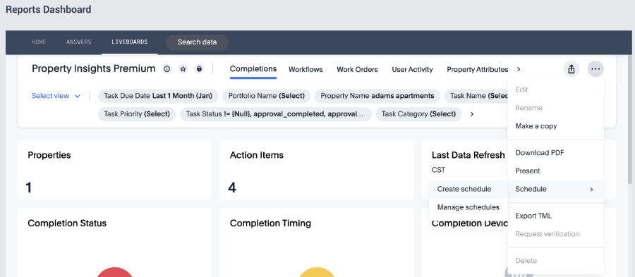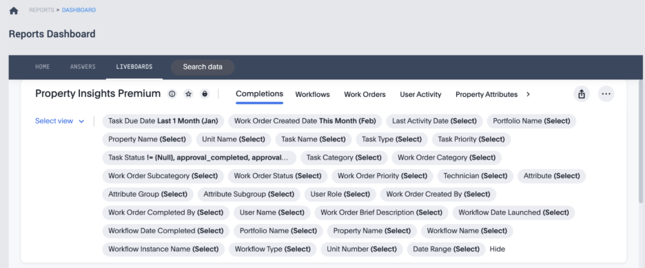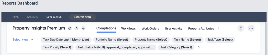 Filters allow you to narrow the dashboard data to a specific property, time period, or workflow.