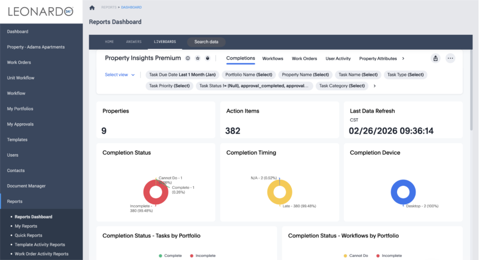 Reports Dashboard provides a live view of your Leonardo247 data through charts, tables, and visualizations. The dashboard updates frequently and reflects the latest activity in your account.