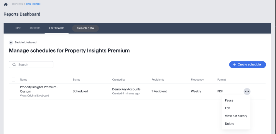 - From there you can Pause, Edit, View run history, or Delete the schedule.