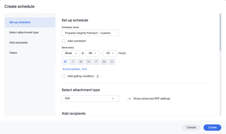 - From there, set your delivery interval by selecting the frequency, time, and days of the week for the dashboard to be delivered.